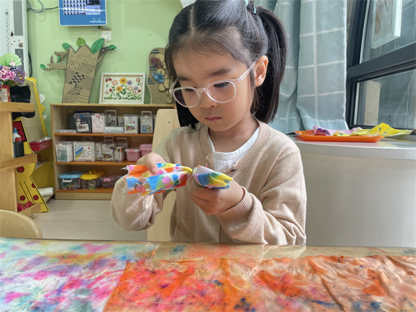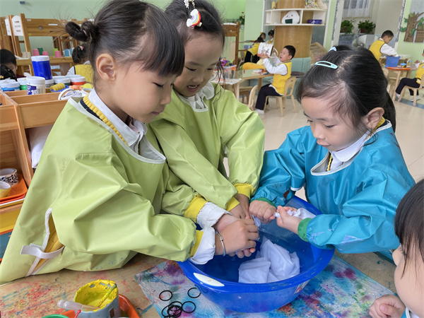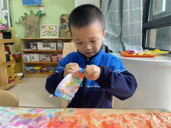 在初次尝试中,孩子们操作兴趣浓厚,扎染对他们来说每一个环节都充满挑战,但只要多尝试几次,扎染处处有惊喜。在活动中当幼儿出现问题时,教师没有直接参与指导,而是给孩子提供思考空间,给予幼儿充足的游戏时间与自主选择探索材料的权力。给孩子们有了操作经验后,我们商议共同制作“扎染步骤图”,让更多小朋友参与到这项有趣的活动中。兴趣是最好的老师,孩子们对扎染工具产生兴趣后,会主动、积极地去探究这些问题,在捆扎遇到问题时,会通过小组合作讨论,积极探究,从而解决疑问,孩子探究、互助合作等能力都得到了极大的提升!步骤图的出现,让孩子们的操作变得更加顺畅了,他们开始尝试不同的技法带来的感受。孩子们个个跃跃欲试,根据自己对色彩的理解,充分利用布料吸水性和色彩的渗透性,染出了风格不同,色彩各异的漂亮图案。孩子们在交流互动中自己得出结论,不同材料不同扎法,图案不一样,多种颜色混在一起会变得脏兮兮的。