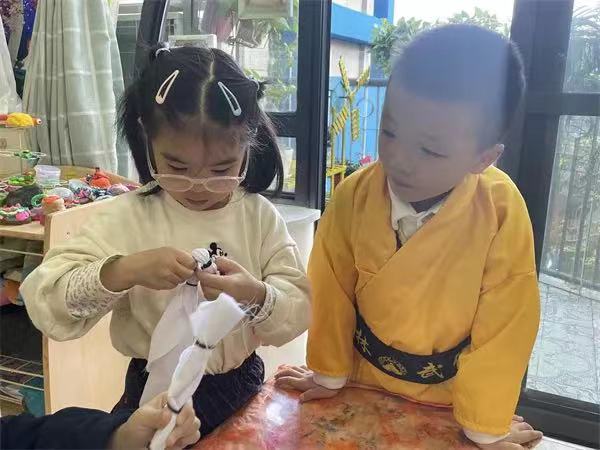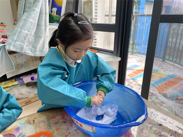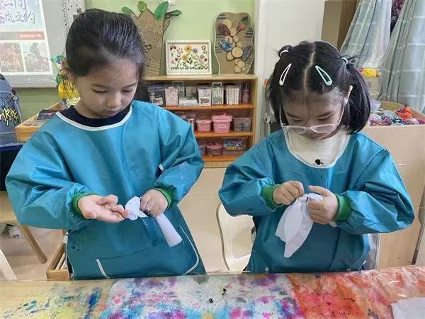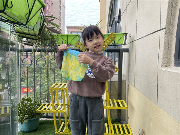 扎染的最大魅力,就在于它的不拘一格。不同的扎结方式,会染出独一无二的扎染艺术。虽然扎结的办法多种多样,而我们选择了比较入门的扎结材料——皮筋。小小的皮筋在孩子们的手中,变得那样的不一般。孩子们通过亲身探索、自由匹配发现扎结与染色之间产生的化学效应,总结出了不同的扎结办法所呈现的图案规律。我们的扎染故事还在继续,期待下一次的精彩。