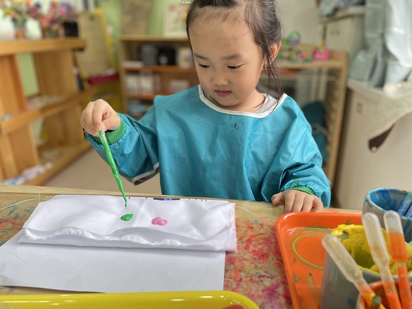 进入扎染区后,孩子们根据自己的喜好选择工具,洋洋说“扎染要先把布扎起来”,兴兴:可是我不会捆扎呢?话刚落音,大家纷纷对布进行各种折叠,并用皮筋扎起来,琳琳第一个扎好,并用滴管把颜料滴上去,发现布并不像她想的那样很快吸收颜料,琳琳用疑惑的眼神看眼前的布,她想试试其它颜料,结果却是一样的。她赶紧抬头问老师,老师,颜色怎么染不上去,这样染,颜料会流下来,洋洋看了大声提议,我想到好办法啦,可以用湿巾!我和我妈妈在家就是这样扎染的。