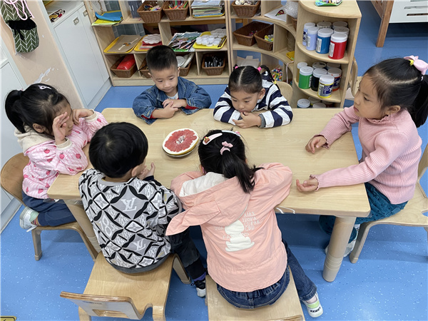 听到孩子们带着对柚子的种种好奇,我们在日常活动中开展了以柚子为主题开展活动。孩子们通过多种感官看一看、闻一闻、剥一剥,尝一尝等形式,让孩子从感官认知开始初步了解柚子。柚子是什么样的呢?“柚子圆圆的,像一个皮球。它的皮上面有一些黑色的小点点”、“我觉得柚子皮有种奇怪的味道,但是我很喜欢”、“剥开里面的皮是白白的、粉粉的;柚子的皮黄黄的绿绿的,绿绿的说明还没有成熟”、“我的柚子皮已经剥好了,给你们看一看”、“柚子好酸啊!”、“我的柚子很甜很甜”......孩子们在尝一尝、摸一摸、闻一闻、剥一剥中,对柚子产生了兴趣。