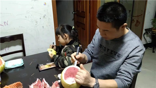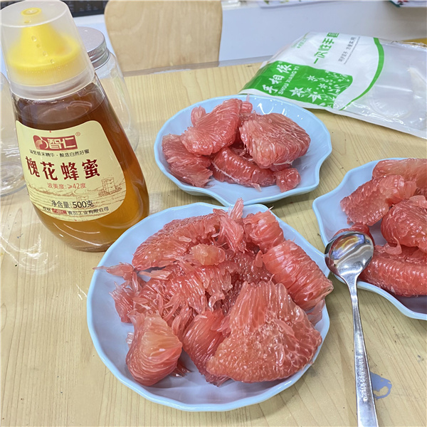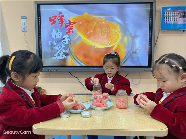 柚子清香、酸甜、凉润,营养丰富,药用价值很高,是人们喜食的名贵水果之一,也是医学界公认的最具食疗效益的水果。有健胃化食、下气消痰、轻身悦色等功用。说干就干,今天我们就要开始制作柚子美食——蜂蜜柚子茶啦!老师带领孩子们细心地将柚子剥皮,切小块。放入杯中捣碎,再加入甜甜的蜂蜜,静置一天……蜂蜜柚子茶出炉咯!在讨论中了解柚子的多用,在劳动中品尝柚子的美味,亲身体验了柚子变茶的过程,感受它从甜甜水果到香香柚子茶的变化,一个随处可见的水果,孩子们探索出了无限的乐趣。