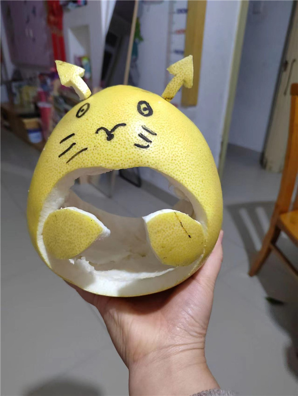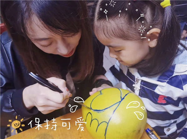 我们把柚子切开,从纵向和横向不同的两个面去观察柚子被切开的样子,在剥开柚子的过程中孩子们又有新发现……“柚子横切的时候一片一片的像花一样”、“有一个像花朵有一个像树叶”......活动中,孩子们通过绘画把自己观察到了柚子画出来,有的小朋友画的是切开来的柚子,看还有种子在中间,有的小朋友画的是整个柚子,还给柚子添加了可爱的表情!相信孩子们通过认识、观察、探索、品尝和绘画等多种方式来认识了秋天的水果——柚子。