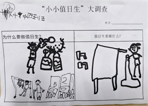 值日生到底要做什么呢?基于孩子们对值日生的浓厚兴趣,在孩子们的讨论后,我们根据孩子们最想了解的内容设计了一张调查表,孩子们回家后和爸爸妈妈利用图片、书本等方式进行学习与调查,并鼓励孩子们在入园后与同伴交流分享自己的发现。