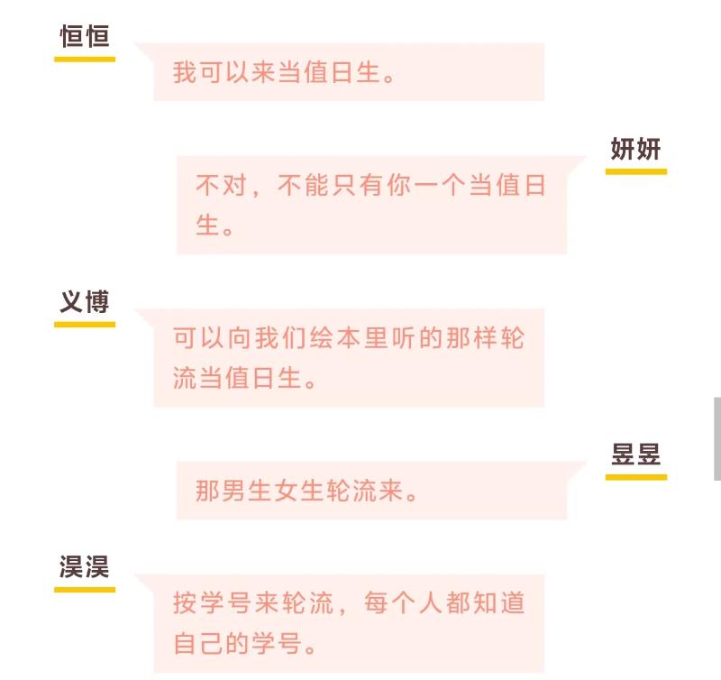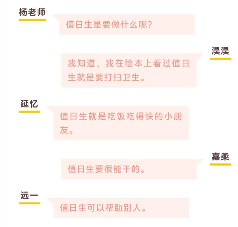 对于中班的孩子们来说,值日生活动是神秘未知又好奇兴奋的。他们对“值日生”的最初印象是什么呢?孩子们进行了一场激烈的讨论: