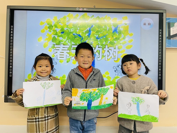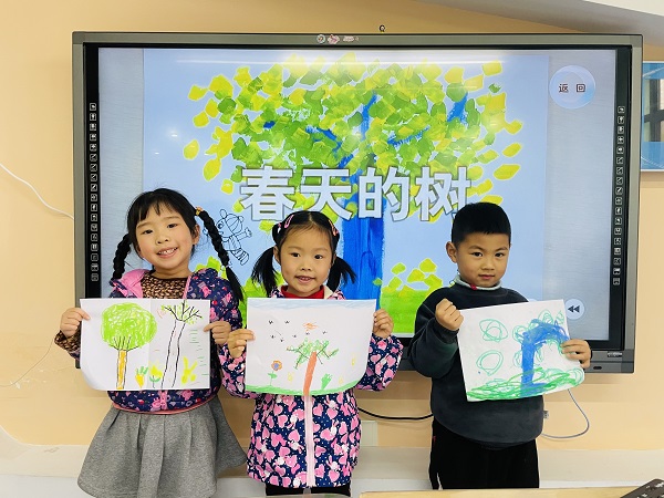 绘画活动开始之前,老师带领孩子们到户外观察春天的树,孩子们兴趣盎然。有的小朋友惊喜的发现路边的大树悄悄的发出了嫩芽,有的小朋友发现小树开出了漂亮的粉色的花朵。回到教室后孩子们将自己看到的、听到的,用完整的语言表述出来。活动中,孩子们用五颜六色的画笔画出了美丽的小树,就如一个个小画家,有的挥笔勾线,有的大胆涂色,在画纸上一展风采,美丽的小树承载着他们丰富的想象,绘出了他们想象中灿烂美好的明天。最后老师将孩子们的作品一一展示出来,布置成春天的画展,请大家互相欣赏学习。