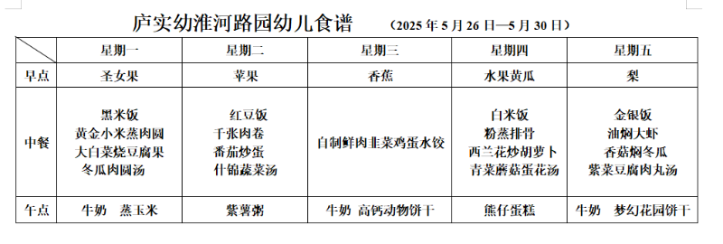 合肥市庐阳实验幼儿园淮河路分园一周食谱(5.26-5.30)
