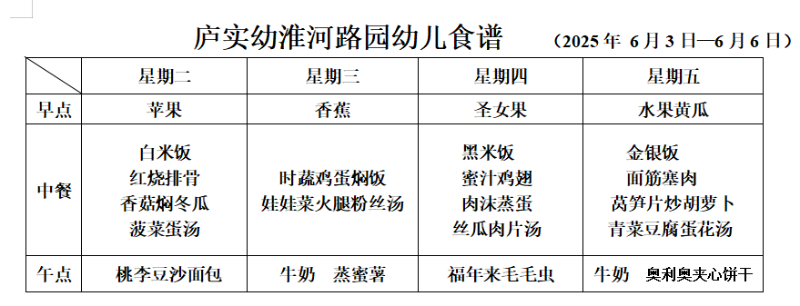 合肥市庐阳实验幼儿园淮河路分园一周食谱(6.3—6.6)