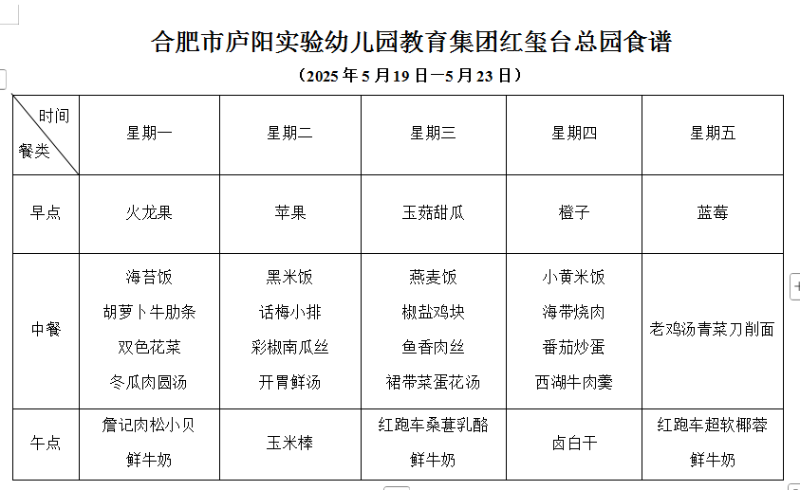 合肥市庐阳实验幼儿园红玺台总园一周食谱(5.19-5.23)