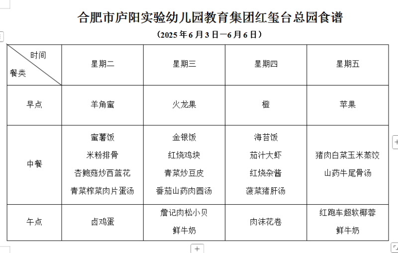 合肥市庐阳实验幼儿园红玺台总园一周食谱(6.3-6.6)