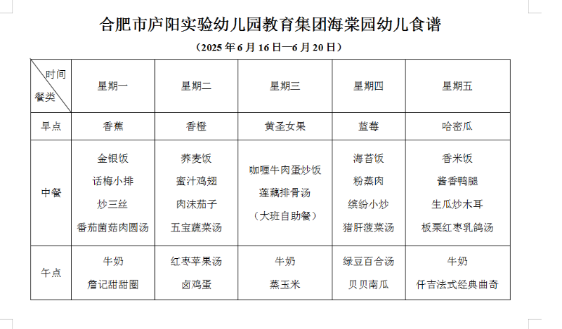 合肥市庐阳实验幼儿园海棠园一周食谱(2025.6.16-2025.6.20)