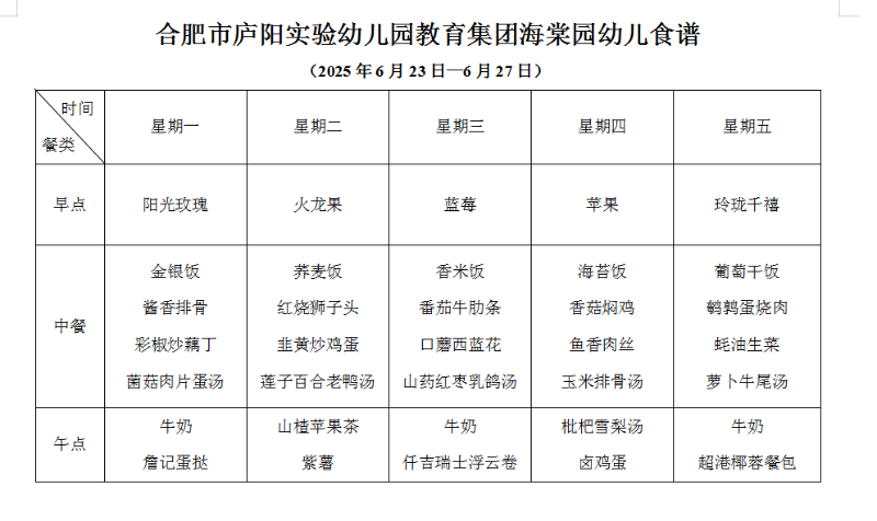 合肥市庐阳实验幼儿园海棠园一周食谱(2025.6.23-2025.6.27)