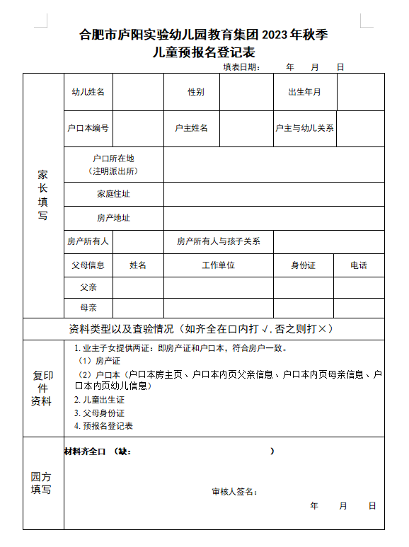 请家长按以上提供的材料顺序编号装牛皮纸文件袋,在文件袋封面注明幼儿姓名、监护人电话,按照要求于6月16日送到庐阳实验幼儿园教育集团四里河畔分园西门口“资料接收点”(所有材料复印件均不退回,请知悉)。幼儿园按顺序录取符合招生条件适龄儿童,额满为止。